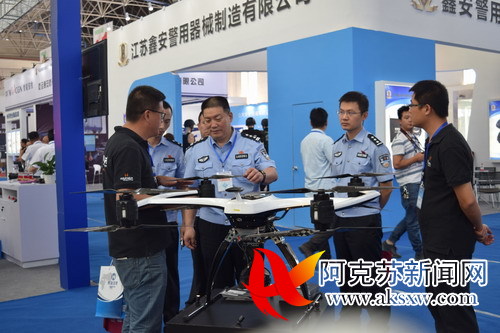 8月8日,警務(wù)人員在2017年首屆新疆(南疆)安防展上參觀哈瓦無(wú)人機(jī)