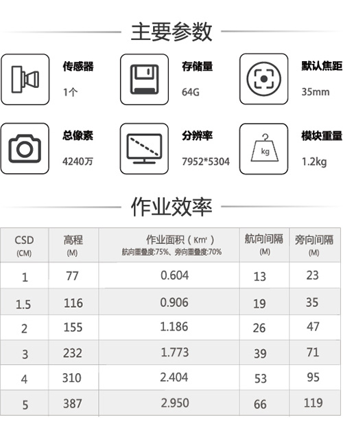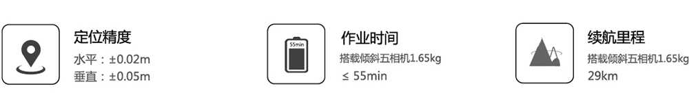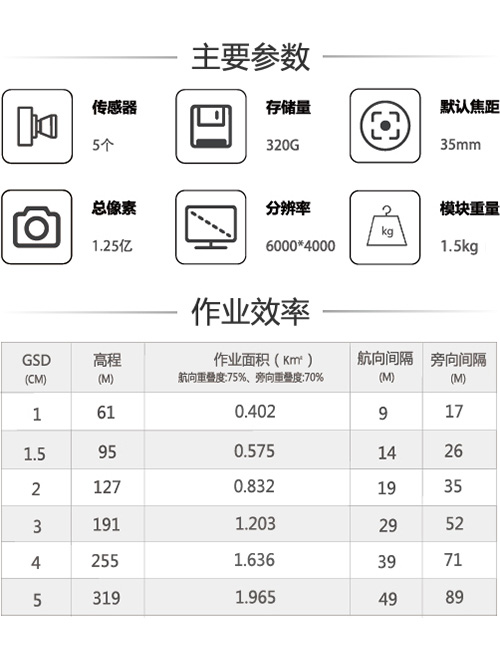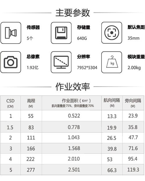1、高效率長航時(智能、高效;單架次搭載傾斜五相機模塊III(重:1.60kg),續航55分鐘。 1:500精度,傾斜作業可達0.66k㎡(GSD:2cm,航向重疊:80%,旁向重疊80%))